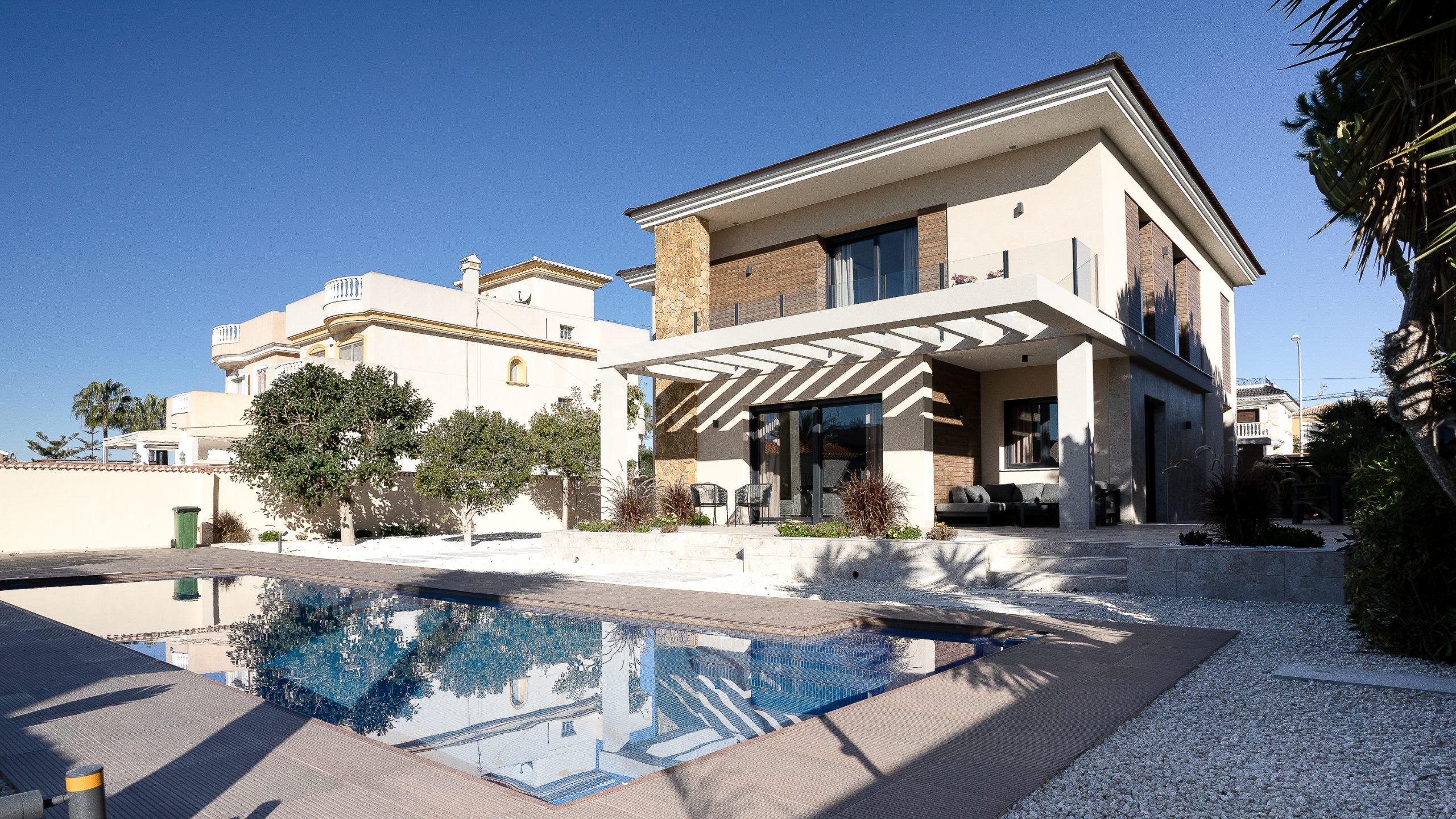 Vivienda unifamiliar aislada con piscina ubicada en Torrevieja. Diseño integral de toda la vivienda tanto exterior como interior.Año de construcción: 2020.Superficie de parcela: 855 m². Superficie construida: 253 m².